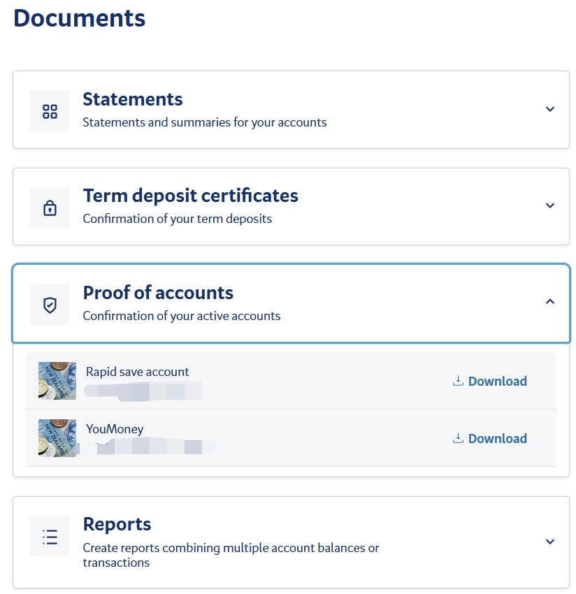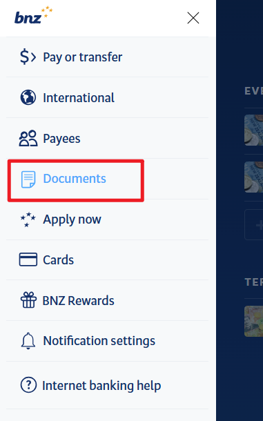 BNZ 网上银行和 App 中的 Document 区域可下载各类证明。
