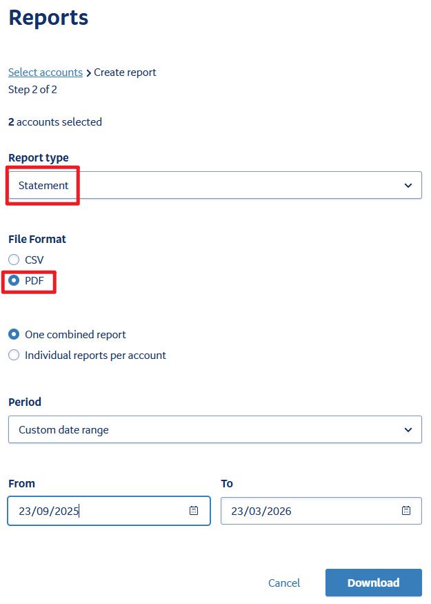 选择 Report type 为 Statement,File Format 选择为 PDF,日期范围根据需求设定即可下载。