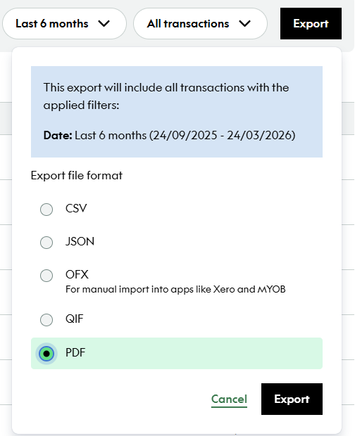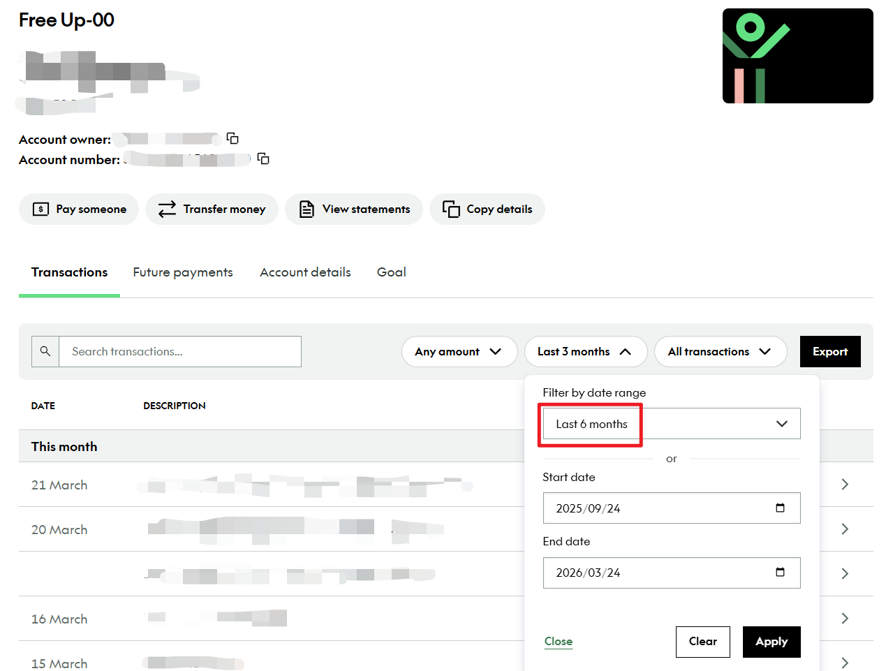 注:因为 Kiwibank 的 Statement 只能按照每个完整季度导出,需要指定日期内的流水按照下面的方式导出 Transaction。