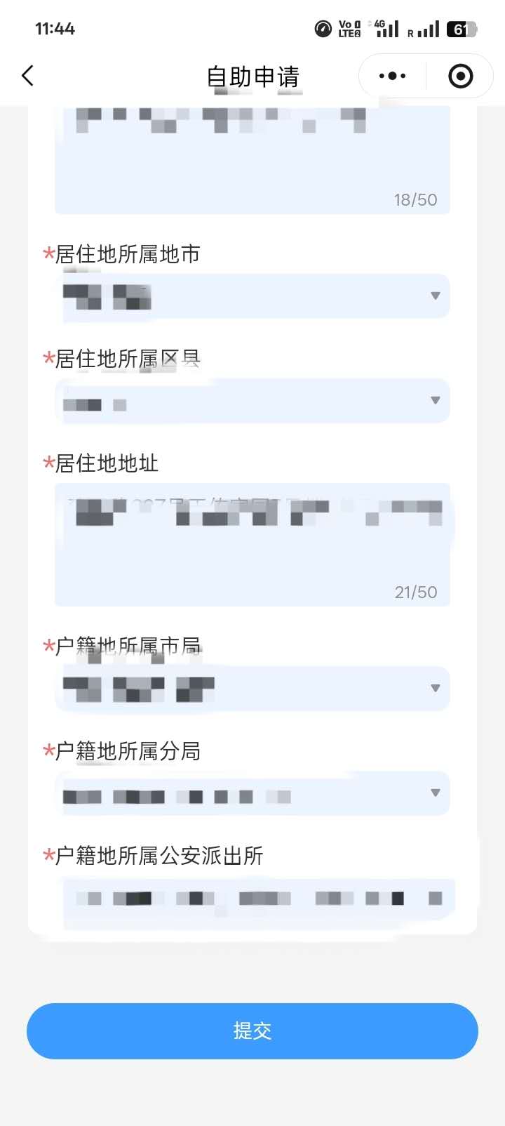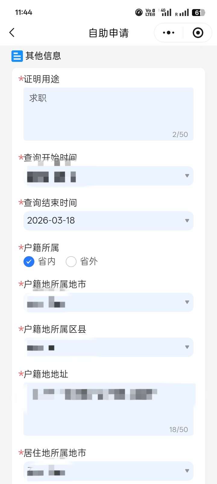 “用途” 根据个人情况填写,建议查询开始和结束日期写从出生到申请时的日期。户籍和居住地按照个人真实情况填写: